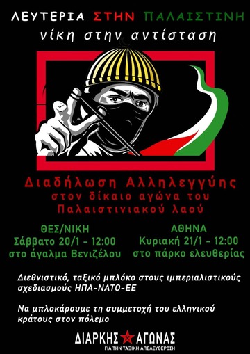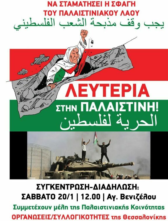 Θεσσαλονίκη | Κάλεσμα στη διαδήλωση αλληλεγγύης στον δίκαιο αγώνα που διεξάγει ο λαός της Παλαιστίνης | Σάββατο 20/1 στις 12.00 στο Άγαλμα του Βενιζέλου