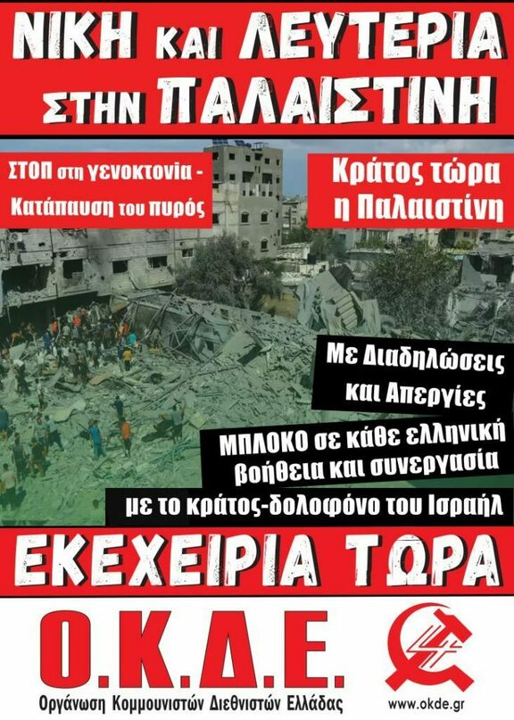 Καλούμε όλο τον κόσμο, τους εργαζόμενους, τους φοιτητές, τους προοδευτικούς πολίτες και όσους μπορούν να κατανοήσουν ότι δεν μπορούμε να μείνουμε άπραγοι μπροστά σε μια νέα γενοκτονία που αυτή τη στιγμή ξεδιπλώνεται σε ζωντανή σύνδεση μπροστά στα μάτια μας. Η κραυγή της Εβραίας διαδηλώτριας στο Λονδίνο κατά την έναρξη του πολέμου ότι όταν λέμε ποτέ ξανά Ολοκαύτωμα εννοούμε εναντίον οποιουδήποτε, ας γίνει οδηγός της Ειρήνης που μπορεί να υπάρξει μέσα από την πραγματική δικαιοσύνη, τη συνολική απελευθέρωση των λαών από τον εθνικισμό, τη θρησκεία, τον ρατσισμό και τη μισαλλοδοξία.