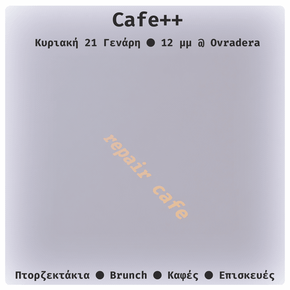 Στο Cafe++ μοιραζόμαστε τις τεχνολογικές μας ανησυχίες και αδιέξοδα, είτε αφορούνε software, είτε hardware, είτε τη γαστρονομία κλπ. Προσπαθούμε να λύσουμε όσα μπορούμε συλλογικά, βαζοβγάζουμε μπρίζες μέχρι να βγάλουμε άκρη, μαγειρεύουμε και παίζουμε συλλογικά.