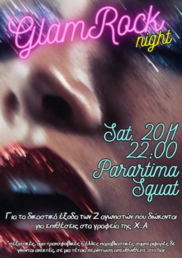 Glam Rock night το Σάββατο 20 Γενάρη από τις 22:00 στην Κατάληψη Παραρτήματος στην Πάτρα για τα δικαστικά έξοδα των δύο αγωνιστών που διώκονται για επιθέσεις στα γραφεία της Χ.Α.