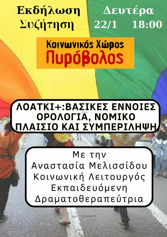 Κάποιοι αναφέρονται σε σημεία των καιρών και άλλοι σε μόδα. Η αλήθεια είναι όμως πως η ΛΟΑΤΚΙ+ κοινότητα υπάρχει, αναπνέει και διεκδικεί, δίπλα μας. Στόχος είναι η συμπερίληψη, στόχος είναι η προστασία των ανθρωπίνων δικαιωμάτων, στόχος είναι η εξάλειψη του φόβου. Η άγνοια είναι μεγάλη σε ότι αφορά την - συμπεριληπτική - ορολογία, το νομικό πλαίσιο, τις καθημερινές δυσκολίες των ατόμων της ΛΟΑΤΚΙ+ κοινότητας. Εν αναμονή ενός νομοσχεδίου που θα δίνει - πάλι - με το σταγονόμετρο δικαιώματα σε συνανθρώπους μας, θα πραγματοποιηθει μία ομιλία/ ανοιχτή συζήτηση για την ΛΟΑΤΚΙ+ κοινότητα, την ορολογία, την συμπερίληψη, την εξάλειψη των διακρίσεων στις υπηρεσίες από εργαζόμενους και για ένα ανοιχτό συμπεριληπτικό σχολείο.