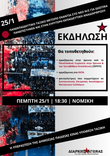[Αθήνα] ΕΚΔΗΛΩΣΗ - ΣΥΖΗΤΗΣΗ: ΠΑΝΕΚΠΑΙΔΕΥΤΙΚΟ ΤΑΞΙΚΟ ΜΕΤΩΠΟ ΕΝΑΝΤΙΑ ΣΤΟ ΝΕΟ Ν/Σ ΓΙΑ ΙΔΙΩΤΙΚΑ ΠΑΝΕΠΙΣΤΗΜΙΑ ΚΑΙ ΣΤΗΝ ΕΥΡΥΤΕΡΗ ΕΚΠΑΙΔΕΥΤΙΚΗ ΑΝΑΔΙΑΡΘΡΩΣΗ