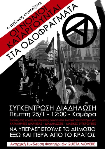 Με όπλα μας την αυτοοργάνωση, την αλληλεγγύη, τις καταλήψεις να περιφρουρήσουμε τις διαδικασίες βάσης και να βρεθούμε ξανά και ξανά στον δρόμο, ενάντια στους ταξικούς φραγμούς, τα ιδιωτικά πανεπιστήμια και να προσπαθήσουμε να δομήσουμε καταφάσεις μέσα στο φοιτητικό κίνημα για ολόκληρη την κοινωνία. Ακριβώς επειδή οι ιδιωτικοποιήσεις αποτελούν κεντρικό πυλώνα της στρατηγικής κράτους και κεφαλαίου, του σάπιου κόσμου της εξουσίας η αμφισβήτηση του νόμου αυτού σημαίνει και την συνολική αμφισβήτηση του σύγχρονου ολοκληρωτισμού.