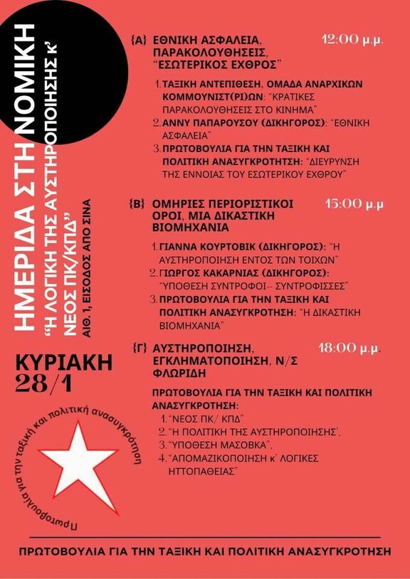 Η ημερίδα αυτή αφορμάται από το νομοσχέδιο Φλωρίδη, το οποίο προτείνει αλλαγές στο Ποινικό Κώδικα (ΠΚ) και στο Κώδικα Ποινικής Δικονομίας (ΚΠΔ). Αφορά τόσο το ίδιο το νομοσχέδιο όσο και επιμέρους ζητήματα ποινικής καταστολής τα οποία έρχεται να ενισχύσει. Παράλληλα, διερευνά το ζήτημα της αυστηροποίησης ως απάντηση του κράτους στις κοινωνικές και ταξικές αντιστάσεις και την εκγληματικοποίηση της πολιτικής δράσης των αγωνιστών/ στριών. Επ' αυτών θα τοποθετηθούν πολιτικές οργανώσεις, δικηγόροι και αγωνιστές/στριες.