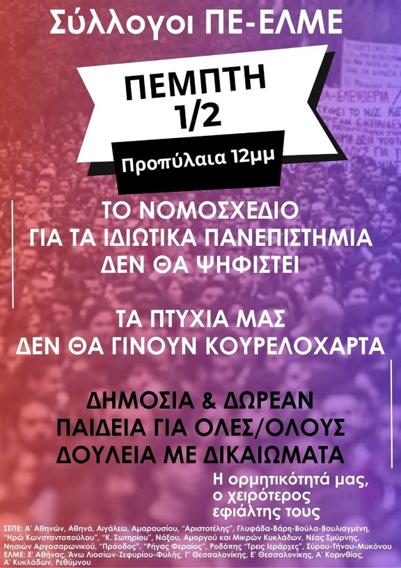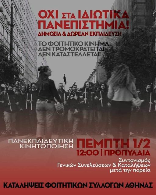 ΚΑΛΕΣΜΑ ΤΗΝ ΠΕΜΠΤΗ 1/2 ΣΤΙΣ 12:00 ΜΜ ΣΕ ΕΚΠΑΙΔΕΥΤΙΚΕΣ ΣΥΓΚΡΝΤΡΩΣΕΙΣ - ΔΙΑΔΗΛΩΣΕΙΣ ΕΝΑΝΤΙΑ ΣΤΑ ΙΔΙΩΤΙΚΑ ΠΑΝΕΠΙΣΤΗΜΙΑ