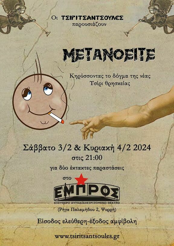 Η θεατρική λειτουργία ΜΕΤΑΝΟΕΙΤΕ, εμπνευσμένη από το βιβλίο «Η Βίβλος για αθεόφοβους» του Τζόμπε Κοβάτα, (μτφ. Παναγιώτης Σκόνδρας, εκδ. Αστάρτη 1998) επιστρέφει στο ελεύθερο αυτοδιαχειριζόμενο θέατρο ΕΜΠΡΟΣ για δύο έκτακτες παραστάσεις.