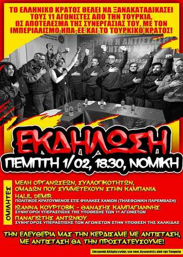 Το ελληνικό κράτος θέλει να ξανά καταδικάσει τους 11 αγωνιστές από την Τουρκία ως αποτέλεσμα της συνεργασίας του με τον ιμπεριαλισμό ΗΠΑ-ΕΕ και το τούρκικο κράτος. Γι' αυτό ο αντιεισαγγελέας του Αρείου Πάγου, Αχιλλέας Ζήσης, έχει ασκήσει αίτηση αναίρεσης κατά της αθωωτικής απόφασης που δόθηκε στο Εφετείο των 11 αγωνιστών, μετά από 97 μέρες απεργίας πείνας. Η αίτηση αναίρεσης κοινοποιήθηκε την ίδια χρονική περίοδο, όπου διεξήχθη η σύνοδος κορυφής του ΝΑΤΟ, στο Βίλνιους της Λιθουανίας, όπου Μητσοτάκης, Ερντογάν και Μπάιντεν συμφώνησαν σε πιο στενή συνεργασία σε όλους τους τομείς.