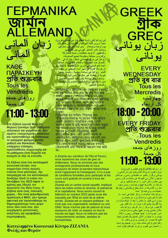 Στα Ζιζάνια (γωνιά Φίλη και Φερών) ξεκινάμε ξανά μαθήματα ελληνικών και γερμανικών. Δεν είμαστε επαγγελματίες δάσκαλοι και προσπαθούμε να σπάσουμε το ιεραρχικό φράγμα μεταξύ μαθητή και δασκάλου. Δεν υπάρχουν επίσημες προϋποθέσεις συμμετοχής και τα μαθήματα είναι δωρεάν και ανοιχτά σε όλα τα επίπεδα.