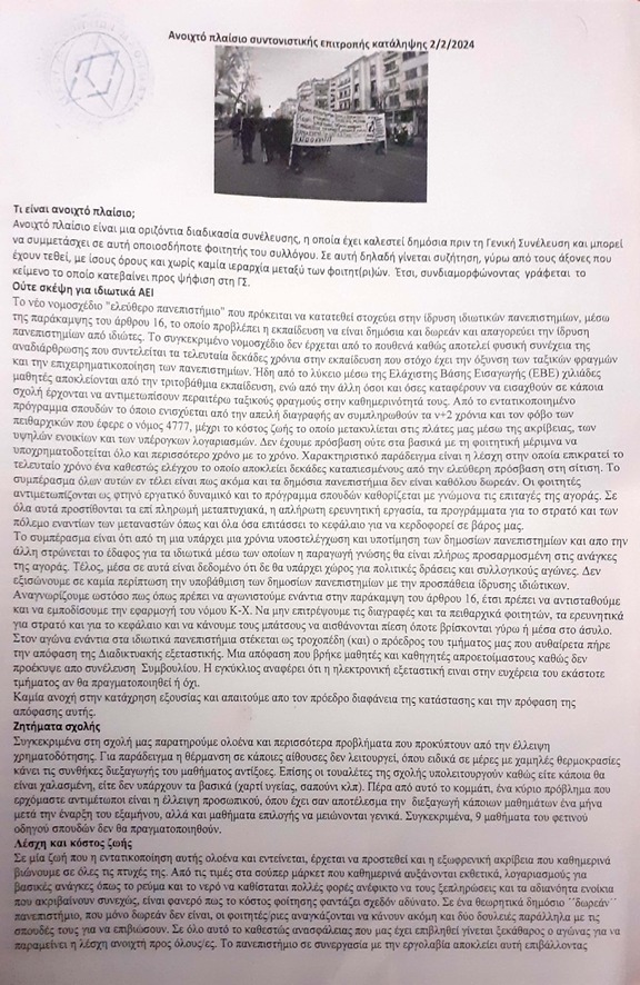 Ως άτομα που κατανοούμε τον συνεχόμενο ταξικό και κοινωνικό ανταγωνισμό και αναγνωρίζουμε την αξία της συμμετοχής σε αγώνες ενάντια στην υποτίμηση των σπουδών και των ζωών μας γενικότερα, θεωρούμε απαραίτητο τον αγώνα για ελεύθερη πρόσβαση στην τριτοβάθμια εκπαίδευση. Η εκπαίδευση για εμάς δεν είναι εμπόρευμα, αλλά κοινωνικό κεκτημένο και σαν τέτοιο θα το υπερασπιστούμε όπως το υπερασπίστηκαν και προηγούμενοι φοιτητικοί αγώνες. Το πανεπιστήμιο δεν είναι ένας στείρος χώρος ακαδημαϊσμού και επαγγελματικής κατάρτισης, όπως θα ήθελε το κυρίαρχο συστημικό αφήγημα να είναι. Το πανεπιστήμιο, το αντιλαμβανόμαστε ως ένα χώρο όπου υπάρχουμε, ζούμε μέσα του κοινωνικά, και δρούμε πολιτικά, μέσα από συζητήσεις, γενικές συνελεύσεις και εκδηλώσεις. Εξαιτίας αυτών, εντός του δημιουργούνται συλλογικές αντιστάσεις, φοιτητικοί/κοινωνικοί αγώνες και γενικότερα ιδέες-ρήγματα στη κυρίαρχη ιδεολογία του κράτους και των αφεντικών. Η αυστηροποίηση και η εντατικοποίηση στις σχολές μας, με τις απειλές για διαγραφές και ποινικοποίηση των δράσεών μας, δεν θα αλλάξει τον τροπο που αγωνιζόμαστε: αντιπροτάσσοντας δηλαδή, το συλλογικο δρόμο από τον ατομικό.