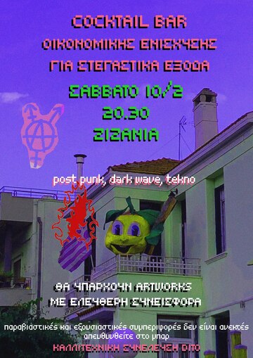 Κοκτέιλ μπαρ οικονομικής ενίσχυσης για στεγαστικά έξοδα κουήρ ατόμου. Τα χρήματα θα δοθούν σε λογαριασμούς και χρωστούμενο νοίκι. Σε ένα ευρύτερο κλίμα φτωχοποίησης, ο κοινωνικός ρατσισμός και οι ανισότητες αυξάνονται καθημερινά και νιώθουμε πιο έντονη την ανάγκη να είμαστε αλληλέγγυα μεταξύ μας, να αλληλοβοηθιόμαστε και να φροντιζόμαστε. Πολλά από μας όντας queer, αντιλαμβανόμαστε τον κοινωνικό αποκλεισμό βιώνοντάς τον καθημερινά με πολλούς τρόπους, όπως όταν προσπαθούμε να βρούμε δουλειά, όταν ψάχνουμε σπίτι. Σε μία πατριαρχική ετεροκανονική κοινωνία, το να βρίσκουμε ασφαλείς χώρους να υπάρχουμε είναι μία εξαντλητική προσπάθεια και γι΄αυτό έχουμε ή μία το άλλο.