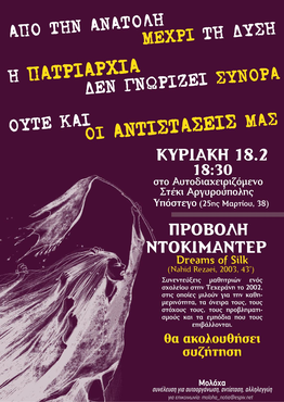 Την Κυριακή 18/2 θα πραγματοποιηθεί προβολή του ντοκιμαντέρ Dreams of Silk στο Αυτοδιαχειριζόμενο Στέκι Αργυρούπολης Υπόστεγο (25ης Μαρτίου 38). Μετά την προβολή, θα ακολουθήσει συζήτηση.