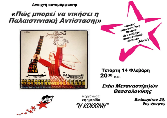 Η αυτομόρφωση της εφημερίδας «Η Κόκκινη» για το πώς θα νικήσει η Παλαιστίνη θα γίνει την Τετάρτη 14 Φλεβάρη στο Στέκι Μεταναστ(ρι)ών Βαλαωρίτου 20 (6ος όροφος), στη Θεσσαλονίκη.