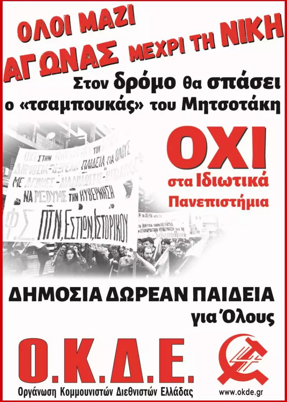Όσα ψέματα κι αν πουν στα πουλημένα ΜΜΕ, όσο κι αν λυσσάνε οι χορτάτοι συνταγματολόγοι για τον «αναχρονισμό» της δημόσιας δωρεάν παιδείας, η παρανομία τους δεν κρύβεται. Το νομοσχέδιο Πιερρακάκη είναι πλήρως απονομιμοποιημένο στη συνείδηση της συντριπτικής κοινωνικής πλειοψηφίας. Η ρητή κατοχύρωση του αποκλειστικά δημόσιου χαρακτήρα της πανεπιστημιακής εκπαίδευσης είναι από τις πιο κομβικές κατακτήσεις μετά την Εξέγερση του Πολυτεχνείου. Ιδιωτικά πανεπιστήμια σημαίνουν: Καταστροφή της δημόσιας δωρεάν παιδείας, μετατροπή της σε μια «αγορά υπηρεσιών», όπου μόρφωση και πτυχία θα είναι πανάκριβο εμπόρευμα για λίγους. Χειροτέρευση της υποχρηματοδότησης και διάλυσης των δημόσιων ΑΕΙ. Πλήρης απαξίωση των πτυχίων. ΔΙΔΑΚΤΡΑ ΠΑΝΤΟΥ. Μαζικός ταξικός αποκλεισμός των φτωχών (με τη γκιλοτίνα και της ΕΒΕ, Τράπεζας Θεμάτων, κατάργησης πολλών ΕΠΑΛ, συγχωνεύσεων σχολείων, «αξιολόγησης» που απειλεί σχολές με λουκέτο). Πριν καν ψηφιστεί το νομοσχέδιο πετάγονται σαν τα «μανιτάρια» οι «σοβαροί επενδυτές», όλος ο νεοφιλελεύθερος βόθρος: από τα funds-κοράκια που ξερογλείφονται για τη δημιουργία ιδιωτικών σχολών, κατασπαράσσοντας κι άλλο δημόσιο χρήμα, μέχρι τις τράπεζες που διαφημίζουν τη θηλιά των φοιτητικών δανείων. Αυτό θα είναι το μέλλον μας, αν δεν τους σταματήσουμε!