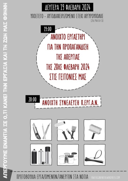Τη Δευτέρα 19 Φλεβάρη, στις 7μμ ακριβώς, στο Υπόστεγο - Αυτοδιαχειριζόμενο Στέκι Αργυρούπολης οργανώνουμε ένα ανοιχτό εργαστήρι για την προπαγάνδιση της απεργίας της 28ης Φλεβάρη 2024 στις γειτονιές μας.