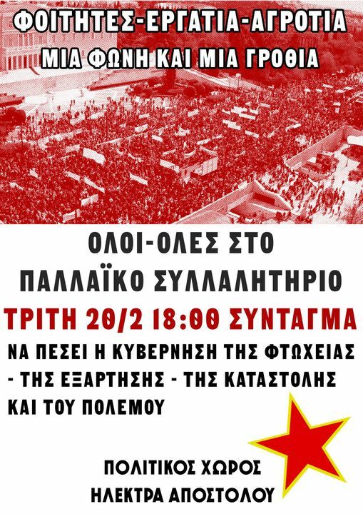 Όλοι-όλες στο Παλλαϊκό Εργατο - Αγροτικό - Νεολαιϊστικο Συλλαλητήριο της 20ης Φλεβάρη