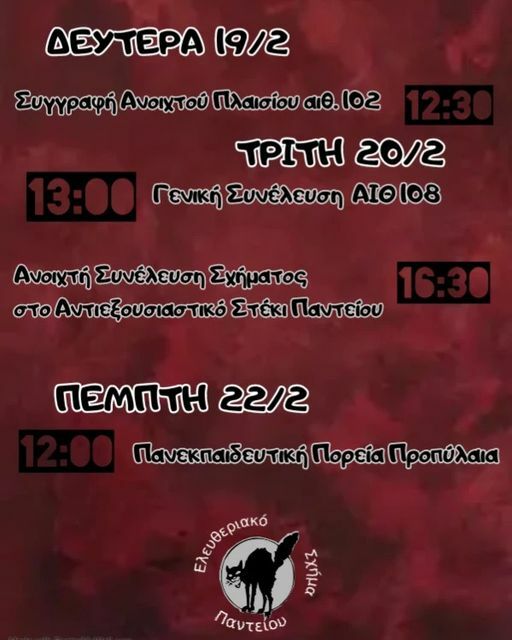 16:30 Ανοιχτή Συνέλευση του σχήματος στο Αντιεξουσιαστικό Στέκι Παντείου (ισόγειο γυάλινου κτηρίου)