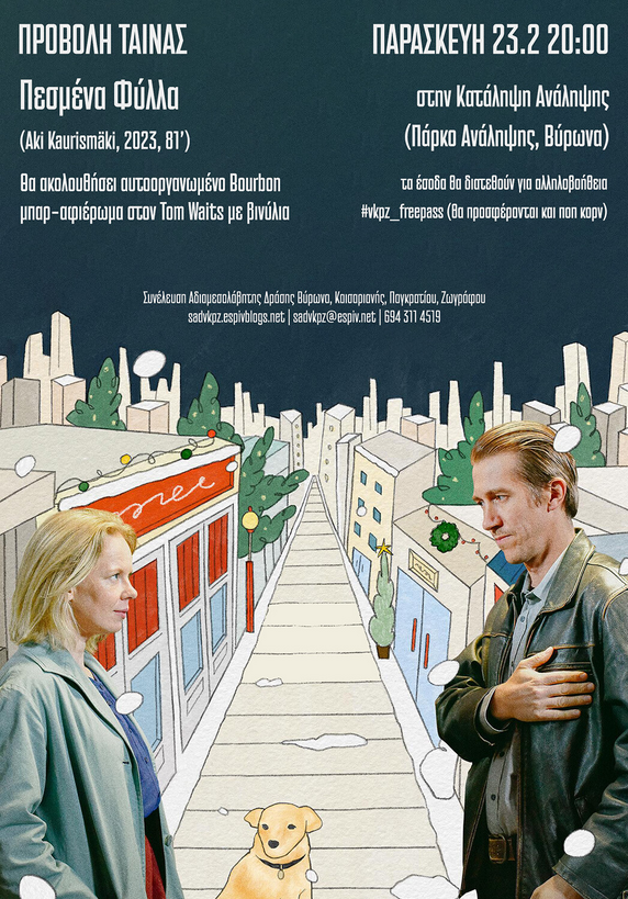 Προβολή της ταινίας "Πεσμένα Φύλλα" του Άκι Καουρισμάκι. Ακολουθεί Bourbon μπαρ - πλήρες αφιέρωμα στον Tom Waits με βινύλια. Τα έοδα θα διατεθούν για αλληλοβοήθεια μελών της συνέλευσης που αντιμετωπίζουν οικονομικά προβλήματα.