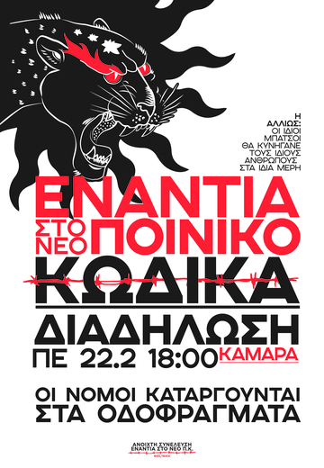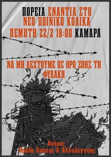 Σε μια πατριαρχική κοινωνία, η οποία ξεπλένει μαστροπούς ανηλίκων και παρασιωπεί όταν δολοφονείται ακόμη μια από εμάς, αρνούμαστε να βρούμε ασφάλεια στις κίβδηλες προφάσεις της για σωφρονιστική αναγκαιότητα.Έτσι δεν αποτελουν έκπληξη οι απολύτως βάναυσες μεταρρυθμίσεις του Ποινικού Κώδικα, καθώς το δικαστικό σύστημα ανέκαθεν λειτουργούσε ευνοϊκά για τις άρχουσες τάξεις, θυσιαζοντας στον βωμό του κέρδους οποιαδήποτε ηθικότητα έμελλε να καταδικάσει. Όποιο υποκείμενο παρεκκλίνει από την «ηθική ευνομία», αποτελεί εχθρό στα μάτια του κράτους, το οποίο αμεσα συνανταται με το τιμωρητικό επακόλουθο του εγκλεισμού σε φυλακές ή/και της απέλασης. Αρνούμαστε να βρούμε εφησυχασμό σε βάρβαρα νομοσχέδια και αποπνικτικά κελιά. Μόνο μέσω συλλογικών, μαχητικών αγωνων που ευωδιάζουν συντροφικότητα και αλληλεγγύη, μπορουμε να επιτεθούμε εναντίον της κρατικής καταστολής.