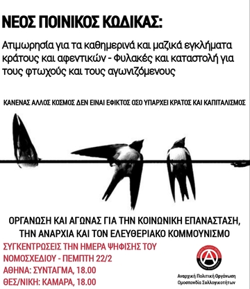 Στην κατεύθυνση αυτή, οι επικείμενες τροποποιήσεις του ΠΚ καταδεικνύουν την προσπάθεια ισχυροποίησης της δόμησης του σύγχρονου ολοκληρωτισμού και της κρατικής επιβολής και ελέγχου πάνω στο κοινωνικό σώμα. Την ίδια στιγμή οι πολιτικές και οικονομικές ελίτ χαίρουν ασυλίας με την προκλητική ατιμωρησία για μια σειρά κρατικών και καπιταλιστικών εγκλημάτων απέναντι στην κοινωνία και τη φύση. Από το έγκλημα στα Τέμπη, τη δολοφονία εκατοντάδων προσφύγων και μεταναστών στο ναυάγιο της Πύλου, τη λεηλασία της φύσης και των τοπικών κοινωνιών με τις καταστροφικές πυρκαγιές στην Εύβοια, τη Ρόδο, τον Έβρο και την Αττική και τις πλημμύρες στη Θεσσαλία μέχρι τις δολοφονίες ρομά από τις συμμορίες της ΕΛ.ΑΣ, τους χιλιάδες θανάτους στα νοσοκομεία λόγω της εγκληματικής κρατικής διαχείρισης της πανδημίας και της επιχείρησης διάλυσης του ΕΣΥ και τις δεκάδες εργατικές δολοφονίες στα κάτεργα της μισθωτής σκλαβιάς.