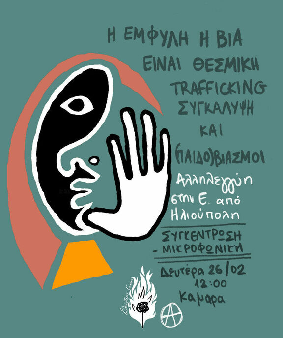 Τη Δευτέρα, 26 Φλεβάρη, η Ε., θύμα σωματεμπορίας, της υπόθεσης trafficking στην Ηλιούπολη, καλείται ως κατηγορούμενη από την ελληνική δικαιοσύνη. Η ανάγκη του σάπιου πατριαρχικού, εκμεταλλευτικού και καταπιεστικού συστήματος να συγκαλύψει τα κυκλώματα trafficking, να ξεπλύνει και να ρίξει στα μαλακά τους εμπλεκόμενους, εν προκειμένω και έναν μπάτσο, φτάνει μέχρι το σημείο, με απόλυτη αλαζονεία και θρασύτητα να διώκει την Ε. για πράξεις που έκανε το διάστημα που βρισκόταν υπό τον έλεγχο και τις απειλές του κυκλώματος μαστροπείας. Και η αναισχυντία δεν έχει τέλος, αφού τη μήνυση βάσει της οποίας την σέρνουν τώρα στα δικαστήρια, την έκανε ο ίδιος ο Δ.Μπουγιούκος, δηλαδή ο καταδικασμένος για σωματεμπορία μπάτσος που την εξέδιδε.
