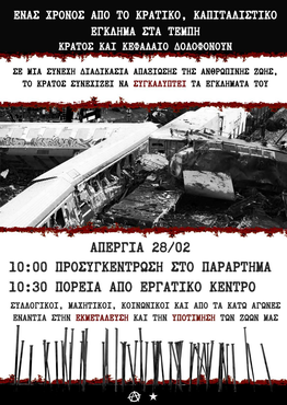 Στις 28 Φλεβάρη συμπληρώνεται ένας χρόνος από το κρατικό-καπιταλιστικό έγκλημα στα Τέμπη που στοίχισε τη ζωή σε 57 ανθρώπους αναδεικνύοντας με τον πιο σκληρό τρόπο τη δολοφονική και αντικοινωνική φύση του κράτους και την αναλγησία του κεφαλαίου που μπροστά στην άντληση ολοένα και μεγαλύτερου κέρδους δεν διστάζουν με ωμότητα και κυνισμό να απαξιώσουν τις μαζικές μεταφορές και τις υποδομές τους και στη συνέχεια να συγκαλύψουν τα αποτελέσματα των επιλογών τους με παρεμπόδιση των ερευνών και εξεταστικές-παρωδία στη βουλή που θα απενοχοποιήσουν τους πολιτικούς προϊστάμενους από τις εγκληματικές ευθύνες τους.