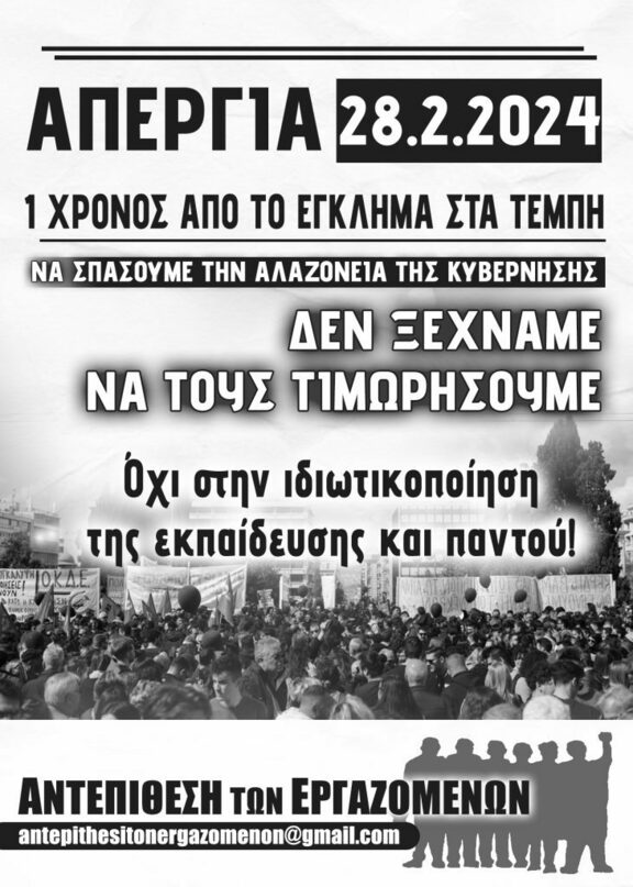 Στηρίζουμε - συμμετέχουμε στην απεργιακή πορεία για τον ένα χρόνο απο την κρατικη-καπιταλιστικη δολοφονία στα Τέμπη την Τετάρτη 28/02 στις 10.00 από την κατάληψη παραρτήματος.