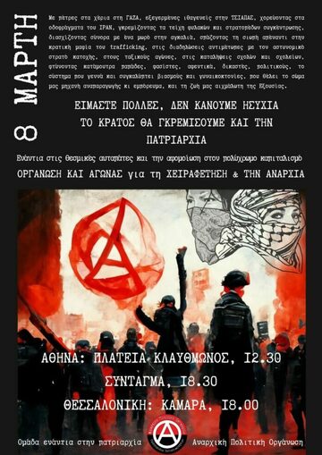 Οι ρίζες της 8ης Μαρτίου ξεκίνησαν από μια απεργία γυναικών που ζητούσαν καλύτερες συνθήκες εργασίας μετά από πυρκαγιά σε ένα εργοστάσιο. Πήρε αντιπολεμικό χαρακτήρα κατά τη διάρκεια του πρώτου παγκόσμιου πολέμου, μια απεργία που ζητούσε "ψωμί και ειρήνη". Έκτοτε έχει αναγνωριστεί από τον ΟΗΕ και έχει "εξυγιανθεί", έχει διεκδικηθεί από terfs και εταιρείες, αλλά εμείς θυμόμαστε τις ρίζες της ως διατομεακό αγώνα ενάντια στην εξουσία και την πατριαρχία, την διεκδικούμε ως κουηρ φεμινιστικό αγώνα για όλα μας. Συνεχίζουμε έναν αγώνα που απαιτεί τη συντριβή του κράτους, του καπιταλισμού και της πατριαρχίας ταυτόχρονα.