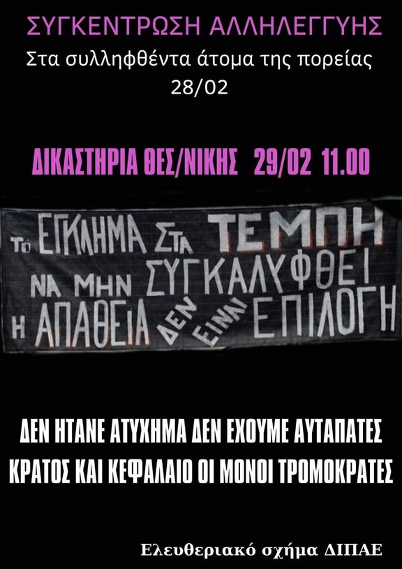 Καλούμε σε συγκέντρωση αλληλεγγύης για τα συλληφθέντα άτομα από την απεργιακή κινητοποίηση για τον 1 χρόνο από την κρατική δολοφονία στα Τεμπη.