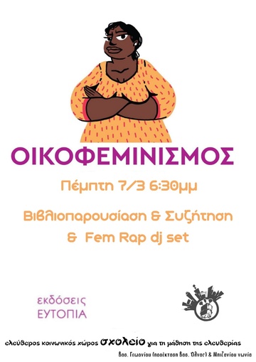 Στα πλαίσια της 8ης Μάρτη, παγκόσμια μέρα αγώνα υπερ των γυναικών, παίρνουμε την πρωτοβουλία να παρουσιάσουμε την ανθολογία κειμένων "Οικοφεμινισμός" σε συνεργασία με τις εκδόσεις Ευτοπία. Θα ακολουθήσει συζήτηση με μέλη των εκδόσεων Ευτοπίας και του Ελεύθερου Κοινωνικού Χώρου "Σχολείο" εμβαθύνοντας στα νοήματα του οικοφεμινισμού όπως επίσης και fem rap dj set!