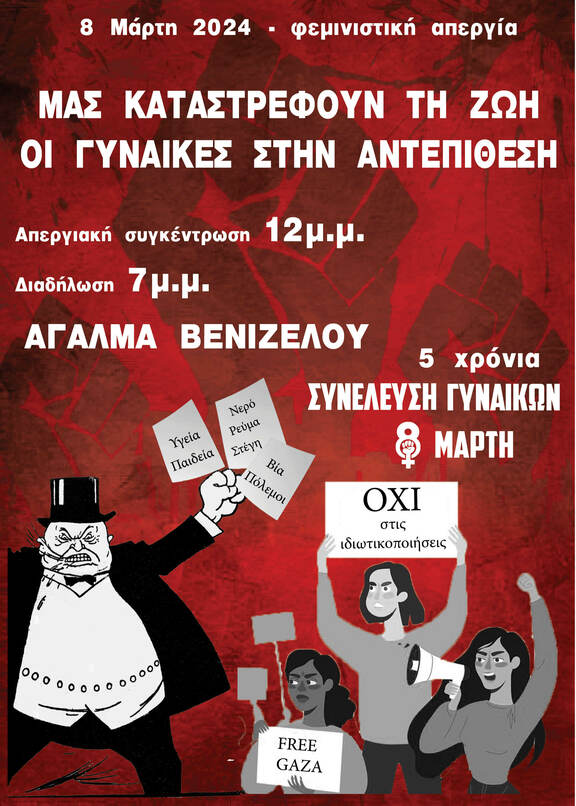 • Οι καταλήψεις, οι φοιτήτριες και οι φοιτητές που παλεύουν µε ένα κίνηµα καταλήψεων στις σχολές ενάντια στα σχέδια του Μητσοτάκη για ιδιωτικοποίηση των πανεπιστήµιων, συζητάνε και αποφασίζουν μέσα από τις συνελεύσεις τους την οργανωμένη συμμετοχή στην απεργιακή 8 Μάρτη. Στα συλλαλητήρια στις 8 Μάρτη συμμετέχουνκαι οι οικογένειες των δολοφονημένων στα Τέμπη. Γυναίκες και άντρες, μητέρες και αδελφοί που έχουν ξεσηκώσει όλο τον κόσμο ενάντια στην κυβέρνηση που συγκαλύπτει το μεγαλύτερο έγκλημα. Ενάντια στην κυβέρνηση των ιδιωτικοποιήσεων και του πολέμου, του ρατσισμού και του σεξισμού.