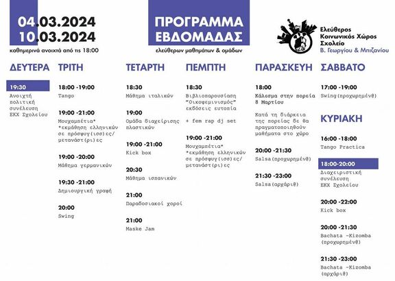 Το εβδομαδιαίο πρόγραμμα στον Ελεύθερο Κοινωνικό Χώρο Σχολείο.