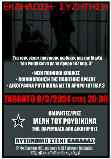 Για αυτό οργανώνουμε στις 9 Μαρτίου μια ενημερωτική εκδήλωση- συζήτηση με μέλη του Ρουβίκωνα και με καλεσμένους δικηγόρους. Μια κουβέντα για τον νέο ποινικό κώδικα, την ποινικοποίηση της πολιτικής δράσης και την φωτογραφική δίωξη του Ρουβίκωνα με το άρθρο 187 παρ. 3 του γνωστού αντιτρομοκρατικού νόμου. Σηκώνοντας τα οδοφράγματα της αλληλεγγύης, οργανωνόμαστε από την βάση και μέσα από την ενημέρωση και την έμπρακτη στήριξη δηλώνουμε παρόντες/ούσες στον αγώνα ενάντια στην στοχοποίηση των συντρόφων/ισσών μας. Γνωρίζουμε πολύ καλά ότι ο Ρουβίκωνας είναι μόνο η αρχή και όσοι πιστεύουν ότι δεν θα αποτελέσουν στόχο, έμμεσα ή άμεσα, του νέου Π.Κ., απατώνται οικτρά. Εργαζόμενοι, ελεύθεροι επαγγελματίες, εκπαιδευτικοί και φοιτητές, σύντροφοι/ισσες και αγωνιστές/στριες, φυλακισμένοι/ες, ιδιοκτήτες πρώτης κατοικίας, νοσηλευόμενοι και νοσηλευτές, έχει έρθει και η δική μας η σειρά. Η μόνη εγκληματική συμμορία αυτού του τόπου είναι η κυβέρνηση Μητσοτάκη και αν δεν αντισταθούμε σε αυτές τις πολιτικές, οι πόλεις μας θα γίνουνε μοντέρνες φυλακές.