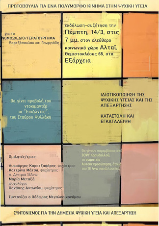 Η "Πρωτοβουλία για ένα Πολύμορφο Κίνημα στην Ψυχική Υγεία" και ο "Συντονισμός για την Δημόσιο Ψυχική Υγεία και Απεξάρτηση" καλούν όλες και όλους στην εκδήλωση-συζήτηση την Πέμπτη, 14/3, στις 7 μμ, στον ελεύθερο κοινωνικό χώρο Αλταϊ, Θεμιστοκλέους 65, στα Εξάρχεια,