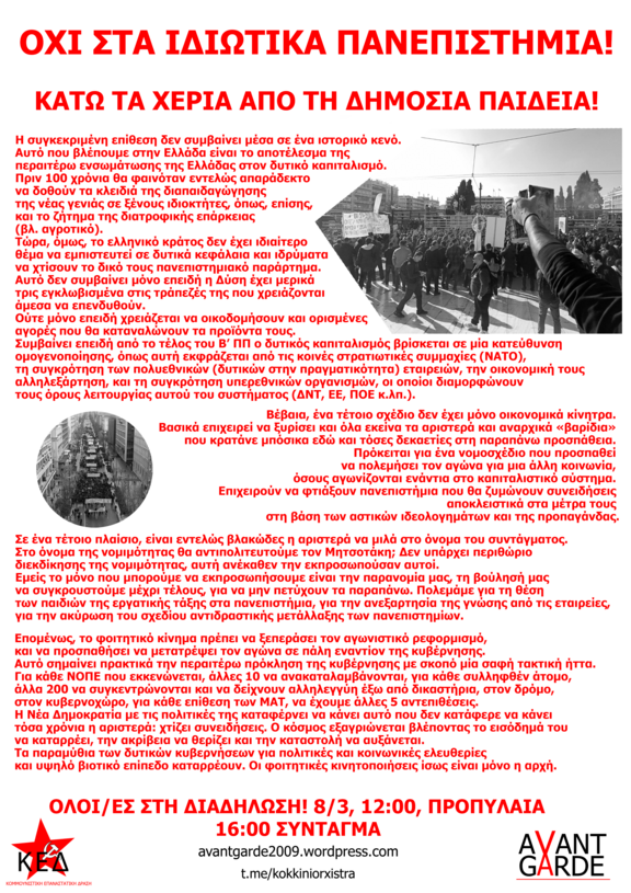Η συγκέντρωση της Παρασκευής αποτελεί στην πραγματικότητα μία συνέχεια της μεγάλης διαδήλωση των 40.000 τουλάχιστον ανθρώπων στις 28 Φλεβάρη. Δεν είναι μία «συνέχεια των φοιτητικών αγώνων». Η πραγματικότητα έχει φέρει τα δύο ζητήματα, αυτό του κρατικού εγκλήματος στα Τέμπη κι αυτό των ιδιωτικών πανεπιστημίων να συναντούν όλη την κοινωνική αγανάκτηση για την ακρίβεια στα super market, τα ενοίκια Νέας Υόρκης, την διάλυση της δημόσιας υγείας, την ατιμωρησία και τη διαφθορά, τους μισθούς πείνας κτλ.
