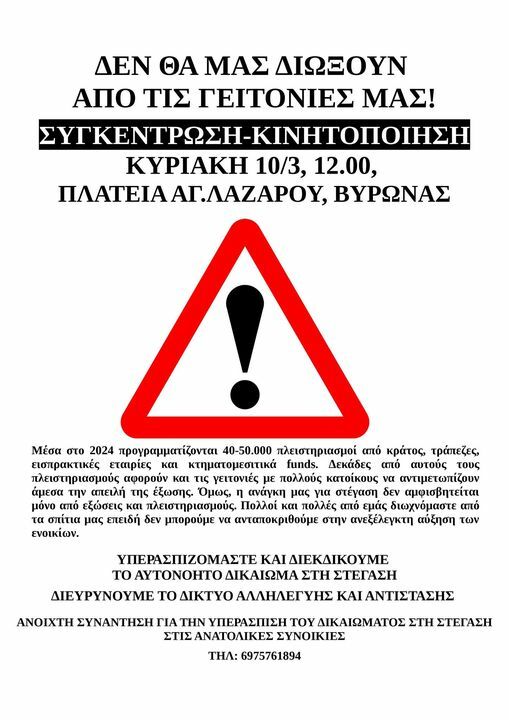 ΚΙΝΗΤΟΠΟΙΗΣΗ Κυριακή (10/3), 12:00, πλ. Αγίου Λαζάρου, Βύρωνας. https://fb.me/e/h6S7Rm3dU
