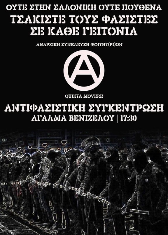 Εμείς ως αναρχικοί και αναρχικές, δηλώνουμε πως οποιαδήποτε κρατική ενορχήστρωση πριμοδότησης της φασιστικής εφεδρείας θα μας βρει μαχητικά απέναντι, σε κάθε πεδίο που αυτή εκφράζεται. Σε σχολεία, σχολές, χώρους δουλειάς, γειτονιές και προπαντός στον δρόμο. Η πάλη ενάντια στον σάπιο κόσμο της εξουσίας, του κράτους και του κεφαλαίου, ενάντια στις φασιστικές επιθέσεις απαιτεί συνεχή και οργανωμένο αγώνα.