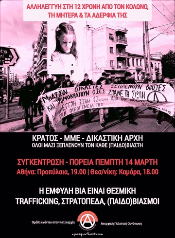 Η υπεράσπιση της 12χρονης και της οικογένειας της, αλλά και κάθε ανήλικου ή ενήλικου ατόμου που βασανίζεται και απειλείται είναι έργο των από τα κάτω. Ενάντια στις θεσμικές αυταπάτες, ας υπερασπιστούμε εμείς το δίκιο. "Αν χρειαστείς βοήθεια, έλα σε μένα". Ο μόνος δρόμος είναι ο συλλογικός μας αγώνας και θα τον δώσουμε με όλες μας τις δυνάμεις, ώστε να μη βρεθεί καμία μόνη απέναντι στους δυνάστες που εξουσιάζουν τις ζωές μας.