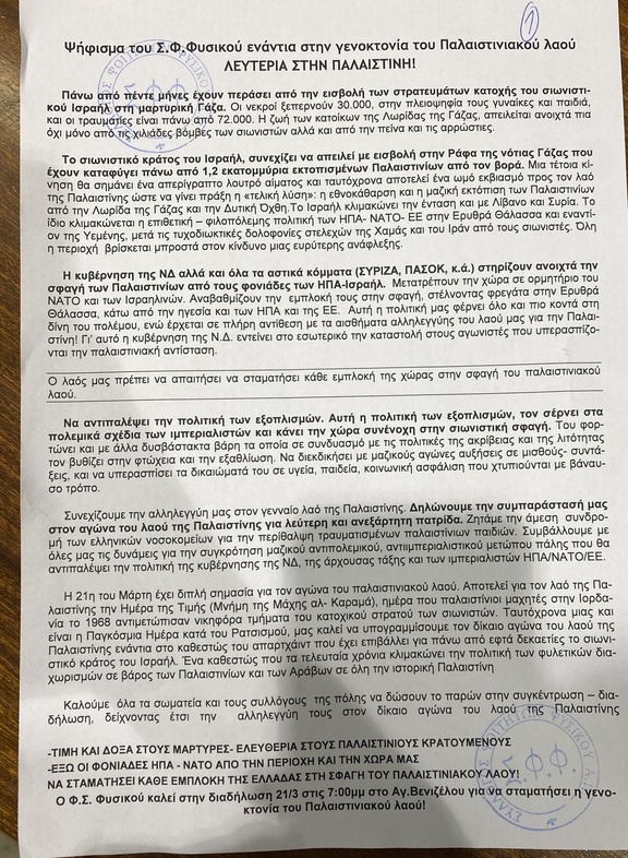 Συνεχίζουμε την αλληλεγγύη μας στον γενναίο λαό της Παλαιστίνης. Δηλώνουμε την συμπαράστασή μας στον αγώνα του λαού της Παλαιστίνης για λεύτερη και ανεξάρτητη πατρίδα. Ζητάμε την άμεση συνδρομή των ελληνικών νοσοκομείων για την περίθαλψη τραυματισμένων παλαιστίνιων παιδιών. Συμβάλλουμε με όλες μας τις δυνάμεις για την συγκρότηση μαζικού αντιπολεμικού, αντιιμπεριαλιστικού μετώπου πάλης που θα αντιπαλέψει την πολιτική της κυβέρνησης της ΝΔ, της άρχουσας τάξης και των ιμπεριαλιστών ΗΠΑ/ΝΑΤΟ/ΕΕ