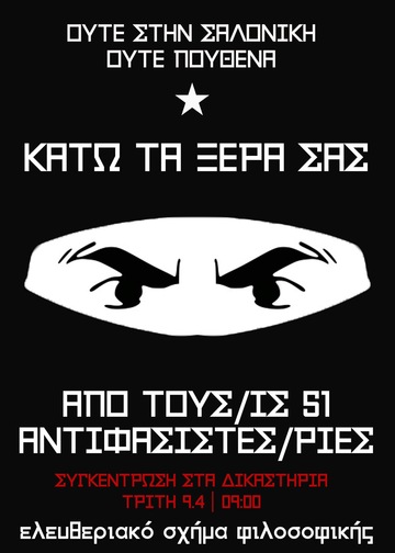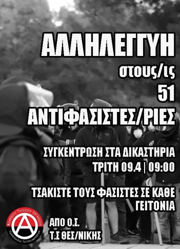 Συγκέντρωση αλληλεγγύης στους/ις 51 διωκόμενους/ες αντιφασίστες/τριες Ι Τρίτη 09/04 Ι 9:00 Ι Δικαστήρια Θεσσαλονίκης