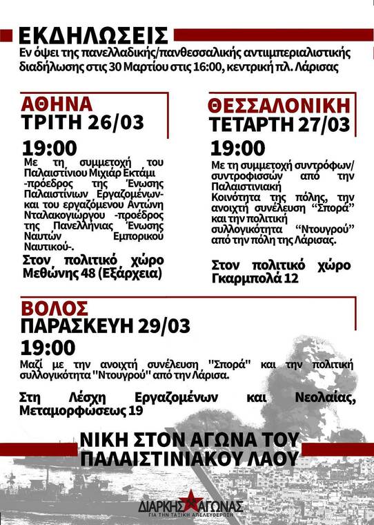 Ο Διαρκής Αγώνας για την Ταξική Απελευθέρωση, εν όψει της πανελλαδικής/πανθεσσαλικής αντι-ιμπεριαλιστικής διαδήλωσης στις 30 Μαρτίου στη Λάρισα, διοργανώνει ανοιχτή εκδήλωση-συζήτηση στον πολιτικό χώρο στην Γκαρμπολά 12, με τη συμμετοχή συντρόφων/συντροφισσών από την Παλαιστινιακή Κοινότητα της πόλης, την ανοιχτή συνέλευση "Σπορά" και την πολιτική συλλογικότητα "Ντουγρού" από τη Λάρισα.