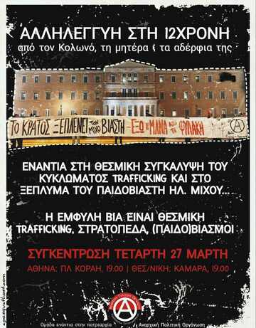 - Πλήρης προστασία του κυκλώματος trafficking στο οποίο συμμετέχουν υψηλόβαθμοι αστυνομικοί, αφού δεν βρέθηκαν καν ως κατηγορούμενοι στη δίκη ούτε η ιδιοκτήτρια ούτε οι υπόλοιποι εμπλεκόμενοι στον οίκο ανοχής, όπου ο Μίχος οδηγούσε το ανήλικο παιδί για να το βιάζουν (υπόθεση Greek police mafia).