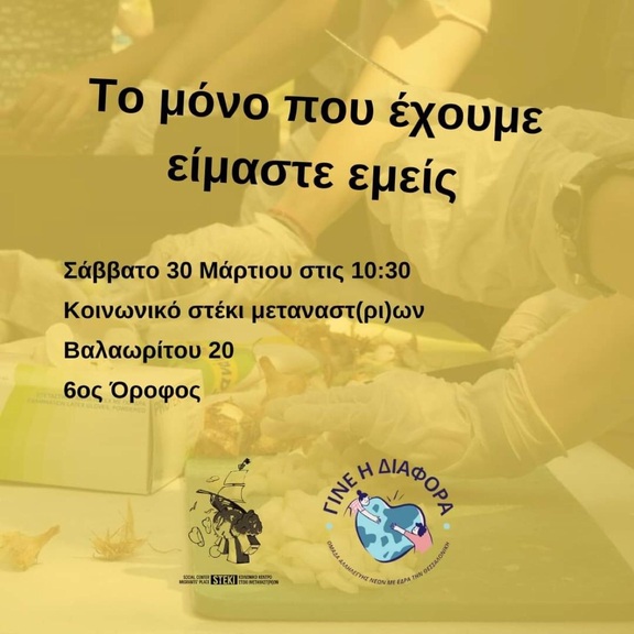 Το Σάββατο 30 Μάρτιου στις 10:30 θα μαγειρέψει η ομάδα του Γίνε η Διαφορά στο Κοινωνικό στέκι μεταναστ(ρι)ων στην Βαλαωρίτου 20.