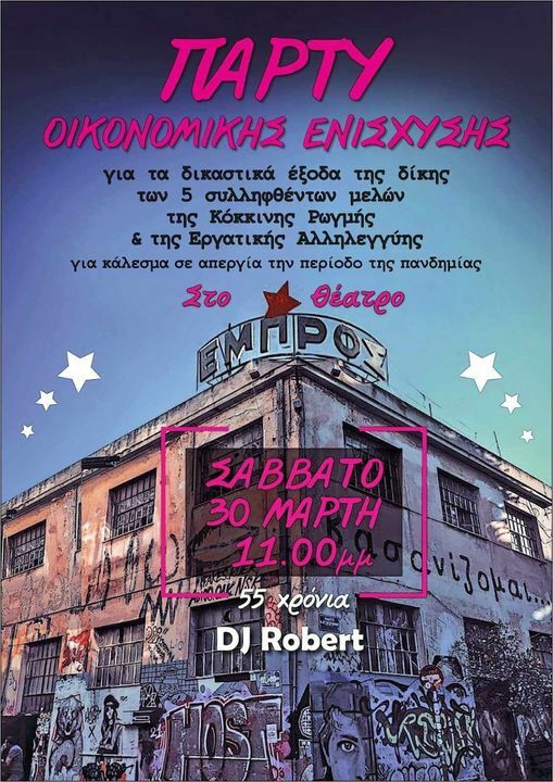 Η Κόκκινη Ρωγμή οργανώνει Πάρτυ οικονομικής ενίσχυσης, στο Θέατρο Εμπρός το Σάββατο 30.03 στις 11.00 μμ, για τα έξοδα της δίκης - πολιτική δίωξη ενάντια σε πέντε συντρόφους που δικάζονται στο Μονομελές Πλημμελειοδικείο Αθηνών, στις 08.04.2024, επειδή τον Νοέμβριο του 2020 μοίραζαν φυλλάδια και την εφημερίδα «Εργατική Αλληλεγγύη», που καλούσαν στην πανεργατική απεργία και συγκέντρωση της 26.11.2020, με την κατηγορία ότι παραβίαζαν τις απαγορεύσεις για την πανδημία.