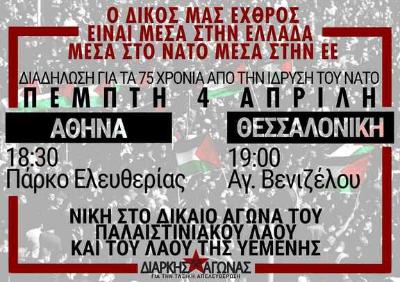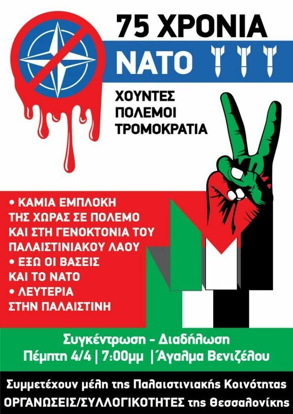 Όλοι/ες στην κινητοποίηση για τα 75 χρόνια από την ίδρυση του Ν.Α.Τ.Ο. την Πέμπτη 4 Απρίλη, 18.30 στο πάρκο Ελευθερίας στην Αθήνα και στις 19.00 στο άγαλμα Βενιζέλου στη Θεσσαλονίκη.