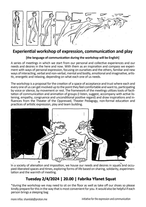 The workshop is a proposal for the creation of a space of acceptance and trust where each and every one of us can get involved up to the point they feel comfortable and want to, participating by voice or silence, by movement or rest. The framework of the meetings utilizes tools of facilitation of communication and animation of groups (I listen, suggest, accompany with active listening, empathy, congruence and unconditional positive regard) and draw inspirations and influences from the Theater of the Oppressed, Theater Pedagogy, non-formal education and practices of artistic expression, play and team building.