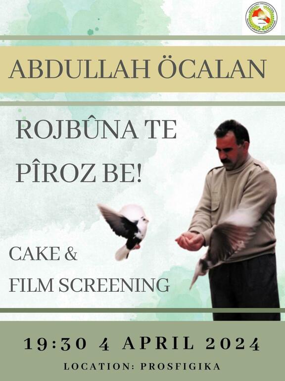 Join us at 19:30 on the 4th of April on the square of the Squatted Neighborhood of Prosfigika to celebrate the birthday of Abdullah Ocalan, Leader of the Kurdistan Freedom Movement. We will screen a short documentary and there will be cake and other sweets.
