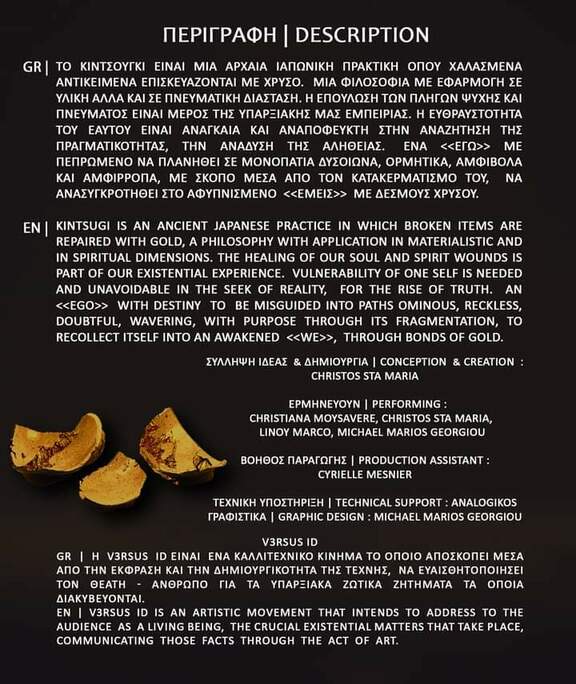 V3rsus ID presents the dance theater play "Kintsugi", at the Free Self-managed Theater Embros, premiere 12 of April at 21.00. We will be happy to see you there and to communicate with you.