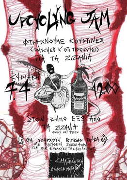 Την Κυριακή 7/4 στις 12:00 μαζευόμαστε για ένα upcycling jam στον κήπο απέναντι από τα Ζιζάνια. Θα υπάρχουν ρούχα/υφάσματα, χρώματα και άλλα υλικά με τα οποία θα φτιάξουμε κουρτίνες για τον χώρο των Ζιζανίων. Σας καλούμε να δημιουργήσουμε μαζί, τόσο τις κουρτίνες όσο και οτιδήποτε το καθένα μας θελήσει. Στον χώρο θα υπάρχει πάγκος με βίγκαν γλυκάκια που θα διατίθενται με ελεύθερη συνεισφορά για την οικονομική ενίσχυση της κατάληψης.