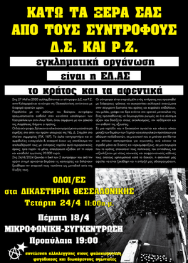 Η ταξική αλληλεγγύη θα τσακίσει την κρατική καταστολή | Να παύσει κάθε διώξη στους αγωνιστές Δ.Σ. και Ρ.Ζ. | Συγκέντρωση αλληλεγγύης Τετάρτη 24 Απριλίου στις 09.00 στα Δικαστήρια Θεσσαλονίκης