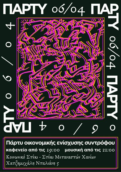 Αυτό το Σάββατο στο Στέκι: Πάρτυ για την οικονομική ενίσχυση συντρόφου με μουσική από τις 9μμ. Το καφενείο θα ανοίξει 7.